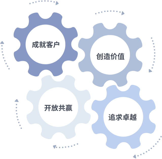 成就客户是一切决策的出发点,,,,创造价值是衡量所有工作的标准,,追求卓越是我们做事做人的态度,,,,开放共赢是我们的格局也是最终的结果。。。。价值观的齿轮环环相扣,,,,推动着组织里的每个人不断向前。。
